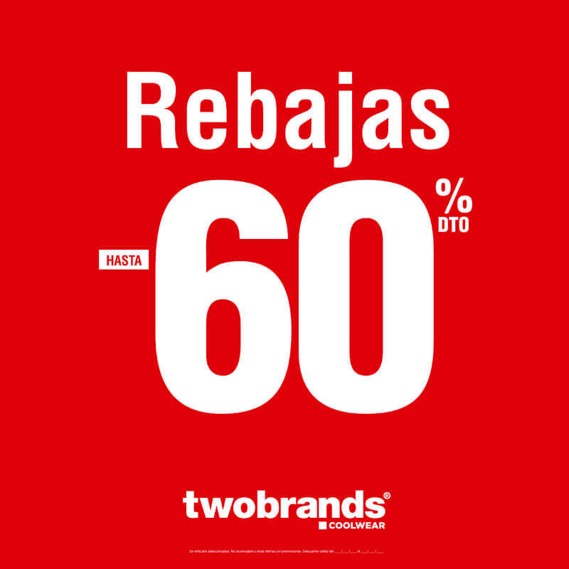 Segunda ronda de rebajas en Twobrands. Nada menos que hasta un 60% de descuento en artÃculos seleccionados. No esperes mucho para ir, solo tienes hasta el 28 de febrero o hasta fin de existencias.