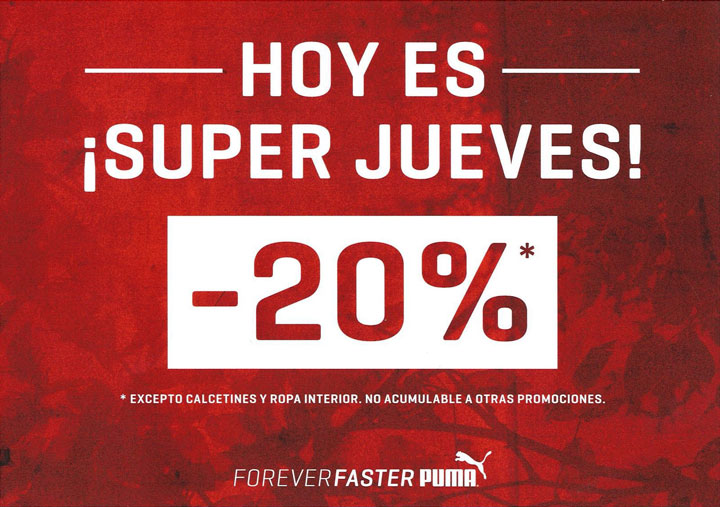 Este SUPERJUEVES visita nuestra tienda Puma y llévate un 20 % de descuento en todo.