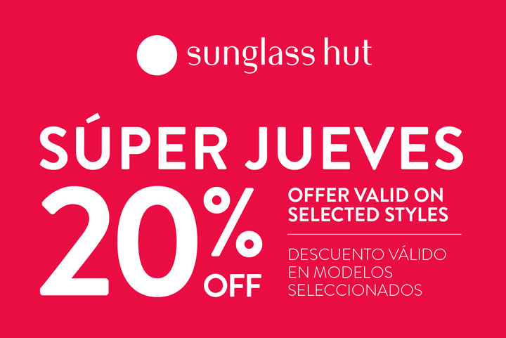 Solo este SUPERJUEVES visita nuestra tienda Sunglass Hut y llévate un 20 % de descuento en modelos seleccionados.