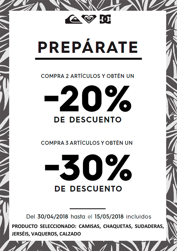 Acércate a Quiksilver para conseguir estos fabulosos descuentos. Compra 2 artÃculos y obtén un 20% de descuento o compra 3 artÃculos para conseguir un 30% de descuento.