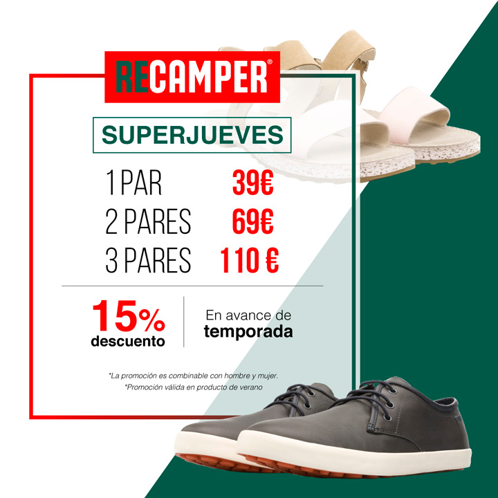 Camper nos trae su promoción en producto de verano con unos precios increÃbles: 1 par por 39 €, 2 pares por 69 € y 3 pares por 110 €, o bien, consigue los avances de temporada con un 15% de descuento.