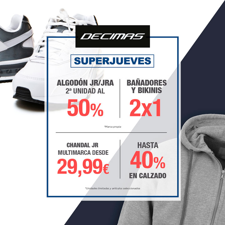 No te puedes perder la visita obligada a Decimas. ¡¡Mira qué ofertas!! Algodón JR/JRA marca propia 2º unidad 50% de descuento, bañadores Hombre 2 x1, bikinis mujer 2 x 1, calzado con hasta un 40 % y chándal JR Multimarca desde 29,99 €.