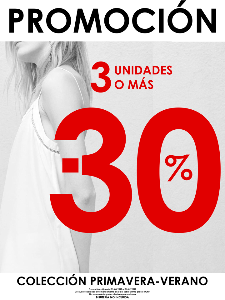 Comprando 3 unidades o más conseguirás un 30% de descuento adicional en la colección Primavera-Verano.