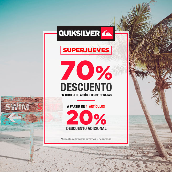 Si estás buscando una gran promoción. No dejes de pasar por Quiksilver, 70% de descuento en todo el producto rebajado y a partir de 4 artÃculos llévate un 20% descuento adicional.