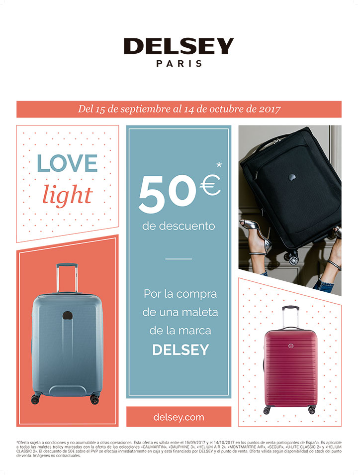 Por la compra de una maleta de la marca Delsey llévate un descuento de 50 €.