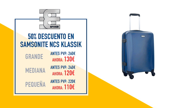¿Pensando en viajar? Pásate por Efanbi y hazte con la promoción del 50% de descuento sobre precio original en maletas Samsonite modelo NCS KLASSIK. Una maleta de policarbonato con una garantÃa de 3 años.