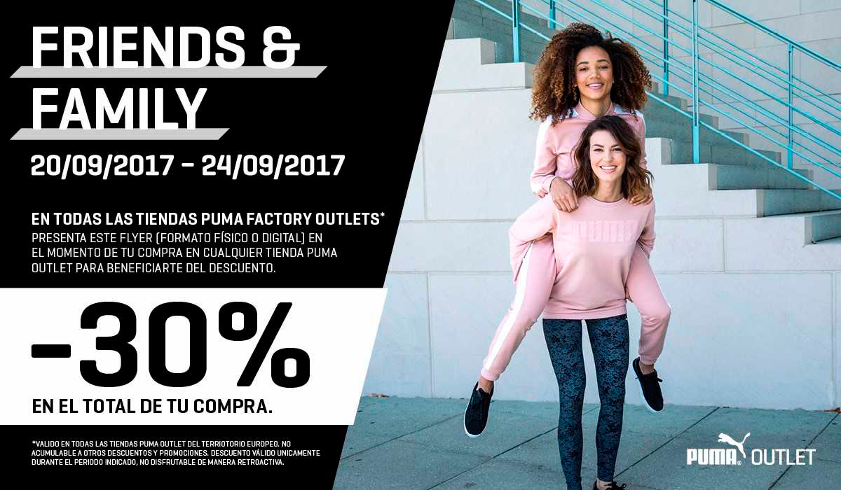 Visita Puma y disfruta de su promoción Friends & Family. Presenta este flyer y benefÃciate de un 30% de descuento en el total de tu compra.