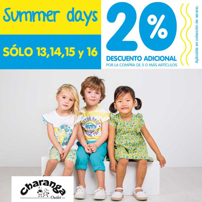 Ven a los Summer Days de Charanga y por la compra de 5 o más artÃculos conseguirás un 20% de descuento adicional sobre el precio rebajado en productos de la temporada de verano.
