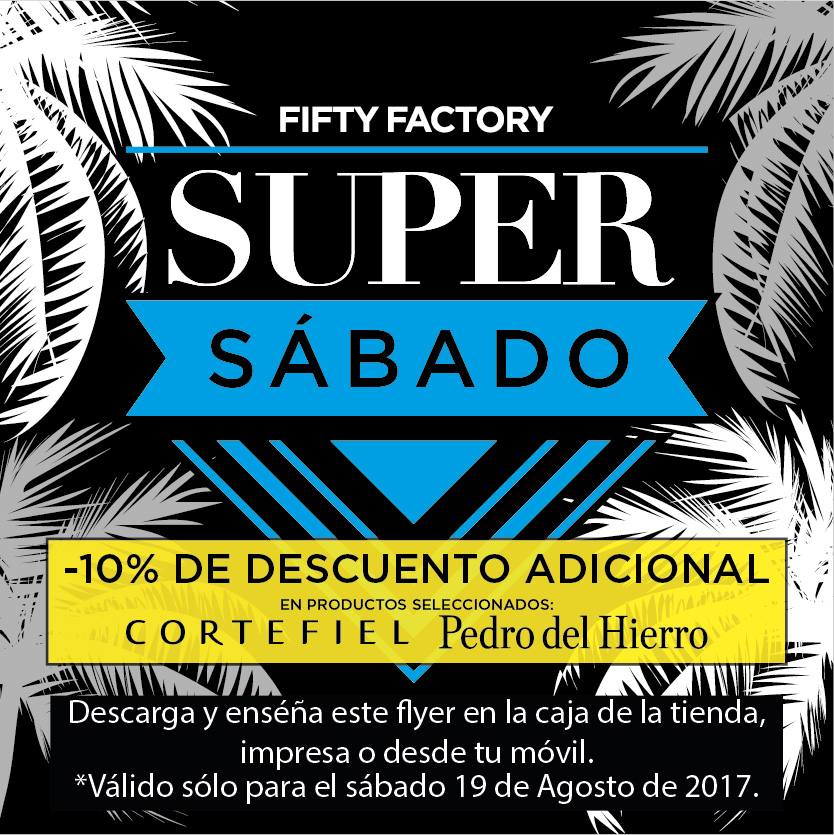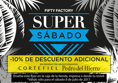 Este sábado ven a Fifty Factory, enseña este flyer en la caja de la tienda, impreso o desde tu móvil y consigue un descuento del 10% adicional en productos seleccionados Cortefiel y Pedro del Hierro.