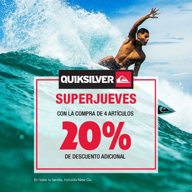 No puedes dejar de venir hoy a Quiksilver. Compra 4 artÃculos y aprovéchate de un 20% de descuento adicional. ¡Corre, corre!