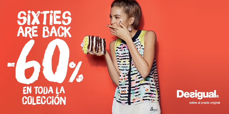 Vuelven los SIXTIES a DESIGUAL los dÃas 7 y 8 de abril. Tienes que venir a vernos porque sólo durante esos dÃas podrás encontrar TODA la colección con un -60% de descuento sobre el precio original.