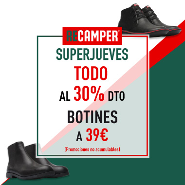¿Buscas lo último en calzado? Ven este #SUPERJUEVES a Camper y disfruta de un 30% de descuento en todos nuestros artÃculos. Además también podrás encontrar toda nuestra colección de botines desde 39 €.