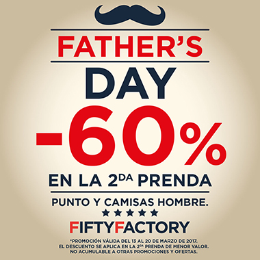 Father’s Day! No te lo pierdas y ven a Fifty Factory. Disfruta de este gran dÃa con un -60% de descuento en la segunda prenda.
