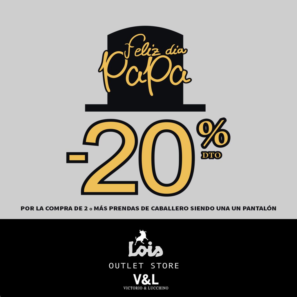 Ven a celebrar con Lois y Victorio & Lucchino el DÃa del Padre y por la compra de 2 ó más prendas de caballero siendo una un pantalón, tendrás un -20% de descuento en tu compra.