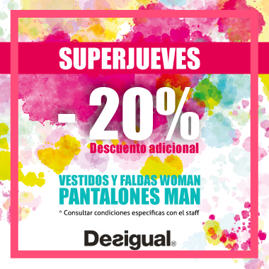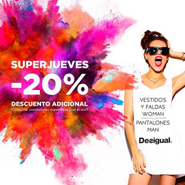 ¡Chicos, chicas, todos sois bienvenidos al superjueves de Desigual! Este #Superjueves Desigual nos ofrece un descuento de un 20% adicional en vestidos y faldas para mujer y en pantalones para hombre.