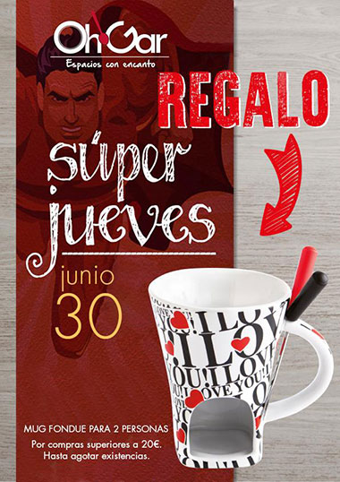 ¡Cómo nos gusta cocinar! Y es que en las tiendas Oh!Gar nos conocen muy bien. Por eso, este #Superjueves nos traen esta estupenda promoción. Por compras superiores a 20 €, llévate de regalo un fabuloso Mug Fondue.