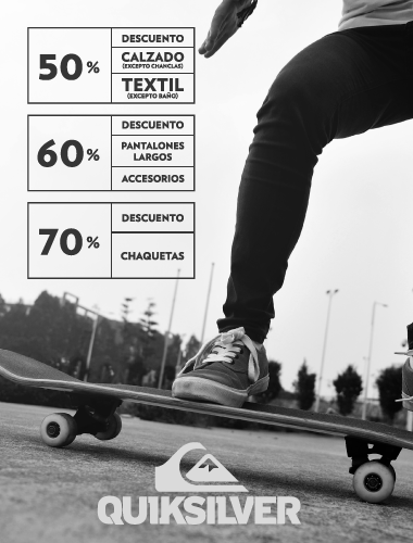 Oficialmente el verano ha llegado y con él, las rebajas de Quiksilver y ¡qué rebajas!… Un 50% en todo el textil (excepto baño), un 50% en todo el calzado (excepto chanclas), un 60% en pantalones largos, un 60% en accesorios y un 70% en chaquetas. Ya son oficiales las rebajas en el Centro Comercial The Outlet Stores Alicante.
