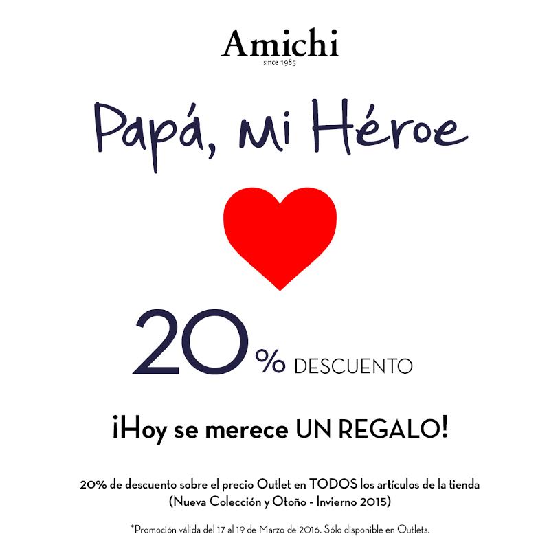 ¡Hoy el papá se merece un regalo! Consigue un 20% de descuento sobre el precio Outlet en todos los artÃculos de la tienda (Nueva Colección y Otoño – Invierno 2015).