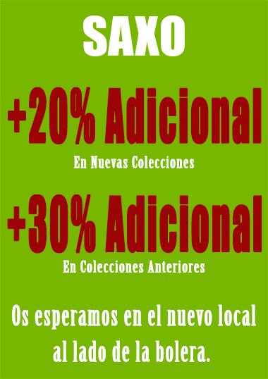 Acércate por nuestra tienda Saxo y consigue un 20% de descuento adicional en nuevas colecciones y un 30% adicional en colecciones anteriores ?