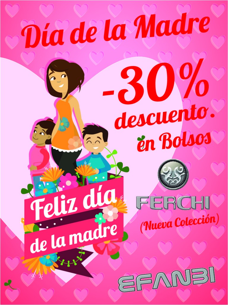 Sabemos que tu madre es única y que se merece lo mejor. Si todavÃa estás buscando el regalo ideal, no le des más vueltas… Pásate por nuestra tienda Efanbi y consigue un 30% de descuento en bolsos de la nueva colección Ferchi.