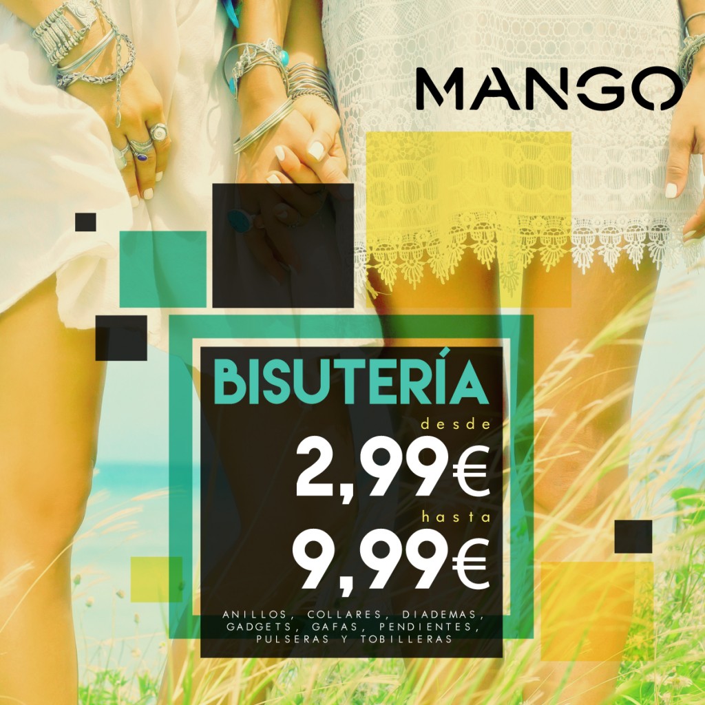 Ahora en Mango tendrás fabulosas ofertas en bisuterÃa desde 2,99 €. Podrás encontrar los mejores complementos para esta primavera: anillos, collares, diademas, gadgets, gafas, pendientes, pulseras y tobilleras.