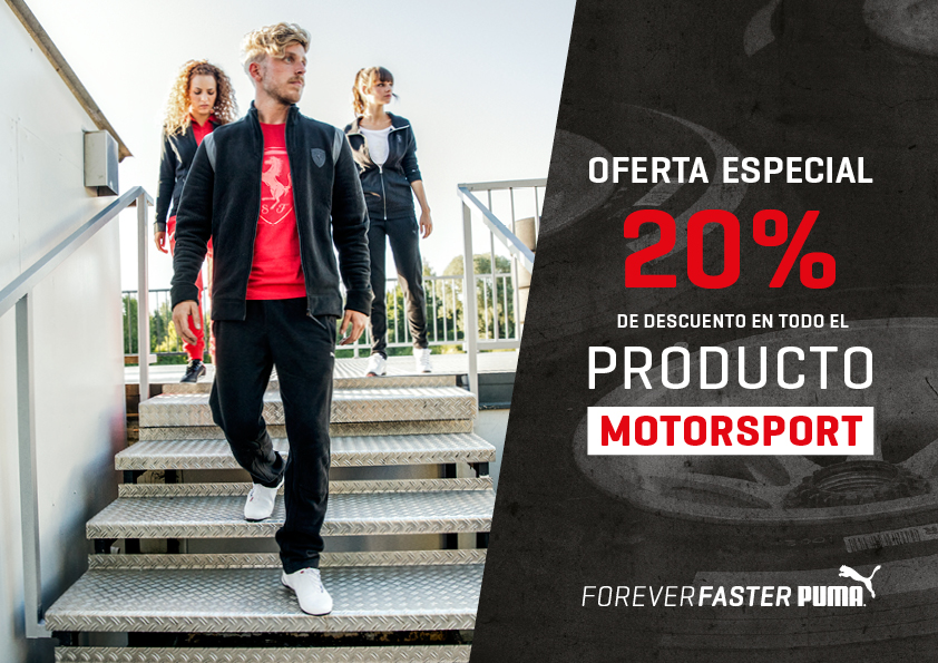 ¡Ven a Puma y aprovéchate de nuestra oferta! Sólo durante este mes (y hasta el 3 de Octubre) podrás llevarte con un 20% de descuento toda la ropa, calzado y accesorios de nuestra lÃnea MOTOSPORT, la cual engloba partners tan reconocidos como Ferrari, BMW y Mercedes Petronas.