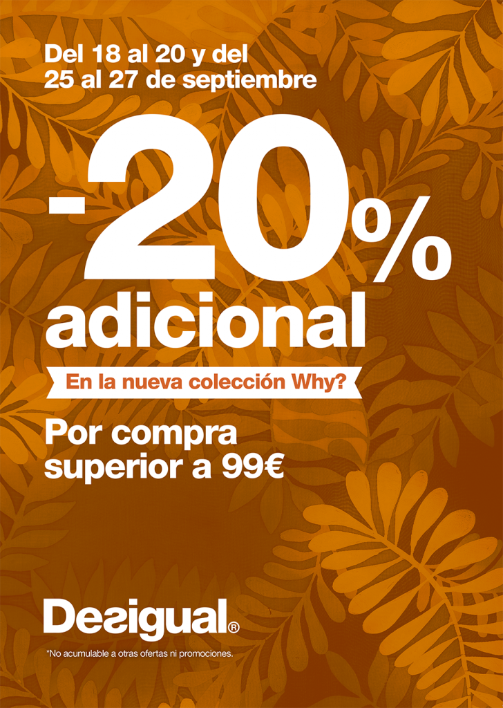 Desata tu pasión por la moda con la nueva colección «Why?» de Desigual, sólo durante los próximos dos fines de semana (del 18/09 al 20/09 y del 25/09 al 27/09) podrás hacerte con ella con un 20% de descuento*. ¡No lo dudes y aprovecha!